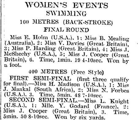To the victor the spoils, but to Jennie Maakal much of the glory. For in many respects her performances against the greatest woman star the swimming world had then produced, Miss Helen Madison, were among the best of the Team, and perhaps the best of any South African swimmer on record at that time. At any rate she caused South Africa's name to be placed in the first three for the first time in an Olympic swimming event.