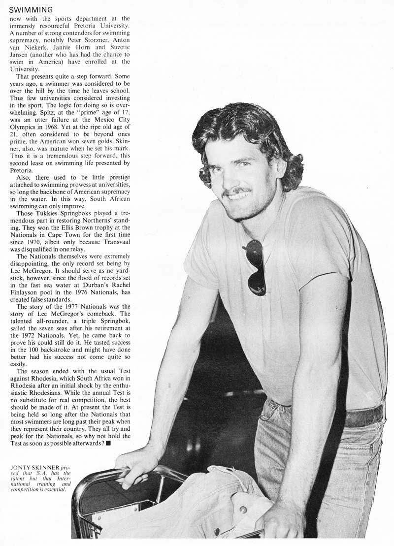 John Alexander Skinner, better known as Jonty, was born in South Africa, educated at Alabama and now coaches the San Jose Aquatic Club in California. He weighed 185 pounds, stood 6’5″ and was the fastest sprinter in the world, but it was 1976, and South Africa was non-grata in the Olympic Games. Jonty watched his friends go one, two, three in the Montreal Olympics on television.