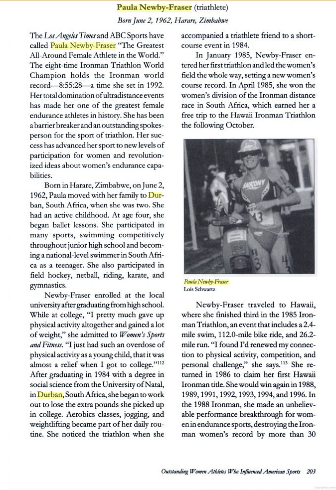After matric she completed a degree in psychology at the University of Natal, graduating in 1984. As a novice she entered - and won - the South Africa triathlon championships in 1984, which won her a trip to the Ironman in Hawaii. After that experience, she wanted more, so she left South Africa for the USA in March 1985 to concentrate on triathlons. Paula won the Ironman World Championship, held every year in Hawaii,  8 times between 1986 and 1996. This race consists of a 3,86 km open water sea swim, a 180km bike ride, and a 42 km run. These victories were so impressive that she was once named "The Greatest All-Around Female Athlete in the World".