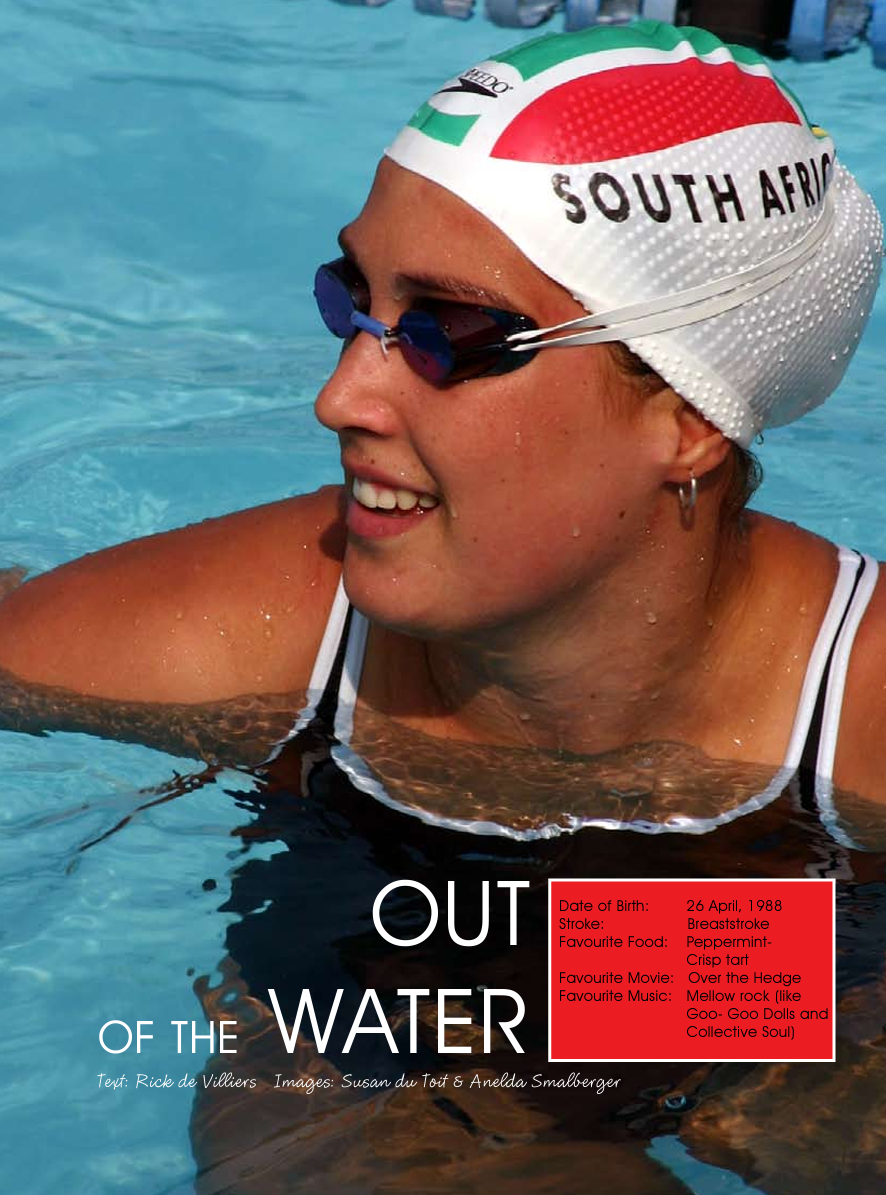 We dry ourselves of the swim talk and get back on track with Suzaan’s behind-the-scenes life. “There’s much more to do in Pretoria and it’s more exciting.” She explains the effect big city life can have on a girl from Bloem. “When my dad and I came to check out the HPC (High Performance Centre) three years ago, I told him this is where I need to be. Since coming here in 2004, I’ve met many people and I’ve learned a lot.” She pauses for a while before speaking again. “You might not believe this, but I’m a lot less reserved now than before I came.”