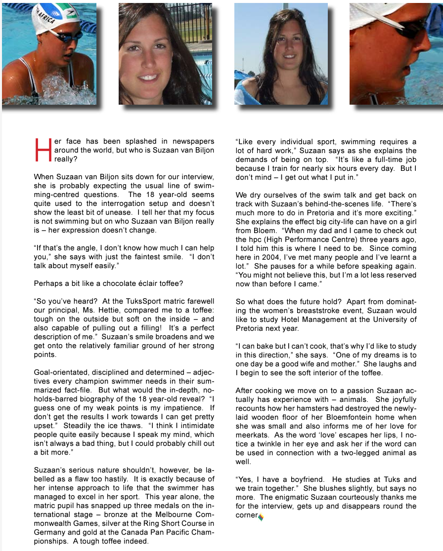 When Suzaan van Biljon sits down for our interview, she is probably expecting the usual line of swimming-centered questions. The 18-year-old seems quite used to the interrogation setup and doesn’t show the least bit of unease. I tell her that my focus is not on swimming but on who Suzaan van Biljon really is – her expression doesn’t change.