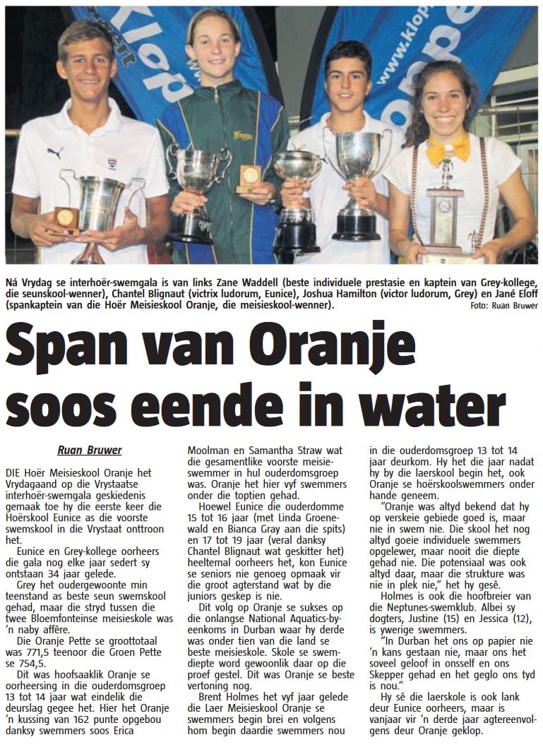 Waddell also finished 22nd in the morning heats of the 100m freestyle in 50.39 sec ahead of another Bloemfonteiner, Eben Vorster. Vorster, who attended Hoërskool Sentraal and is the son of the famous actor, Chris Vorster, finished the evening 51.93 sec, which was good enough for the 48th place. –