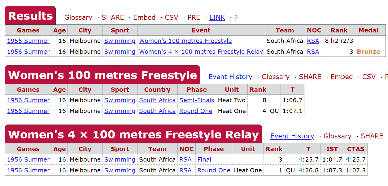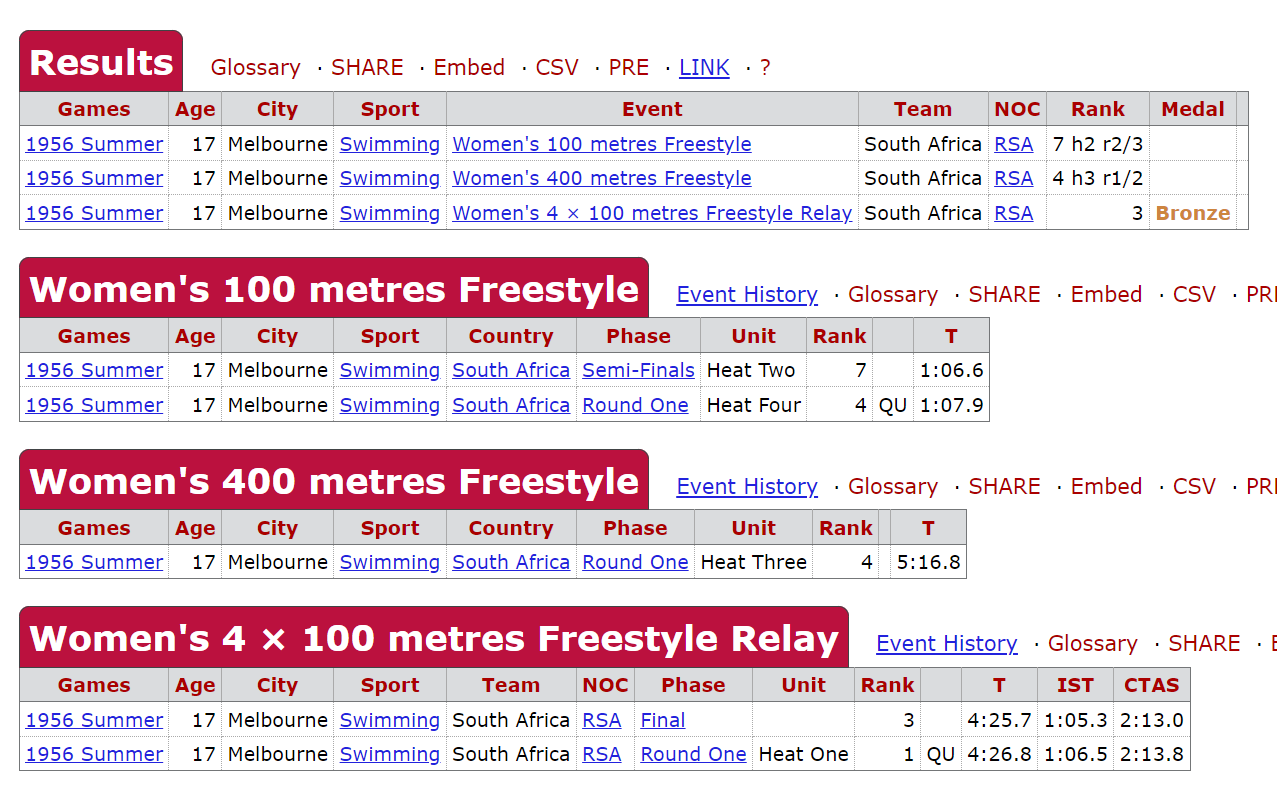 1960 New SA records in the 200 and 400 both long and short courses. I think at that stage she was the longest-serving Springbok.