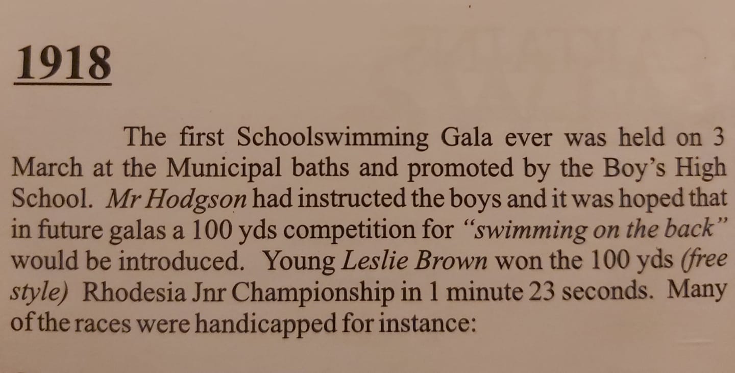 The complex was named Les Brown in 1961 to commemorate the passing of Rhodesia's former swimming champion from the 1920s. Brown's father had been the superintendent of the baths. The pool was 'metricated' in 1970, being shortenend to 50 metres from 55 yards. When the 2.5 cents 'tickey' coin was withdrawn in 1979, the price of entry was reduced to 2 cents.