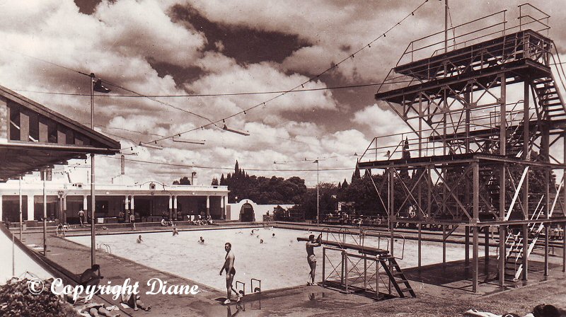 The entrance fee was paid and we were through those squeaky, silver turnstyles. What absolute MAGIC!! I just stood there totally entranced. I had never before seen water with such a wonderful colour. Inez had to drag me along the grassy terraces to the changing rooms on the left hand side of the pool, otherwise I would have stood there all afternoon. There was no babies pool then, so I was taken into the main pool and I must confess to feeling quite a bit frightened at first. However, it didn't take me long before I was having the time of my life and it took a great deal of persuasion to get me out the water again.