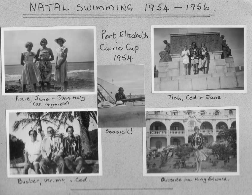 I swam in my first gala at the age of 6 – swam dog paddle and won! When I was 12, and represented Maritzburg Schools. Les Pearce started coaching me. I represented Maritzburg Junior and Senior Schools and Natal Schools. I won the Natal 100yd Backstroke when I was 14 and thus went to Port Elizabeth as a member of the Natal Team for “ Currie Cup” ( the SA National Championships) in 1954. I swam in the freestyle 100yds and in both the Natal team for the freestyle and medley relays. (We didn’t do at all well)