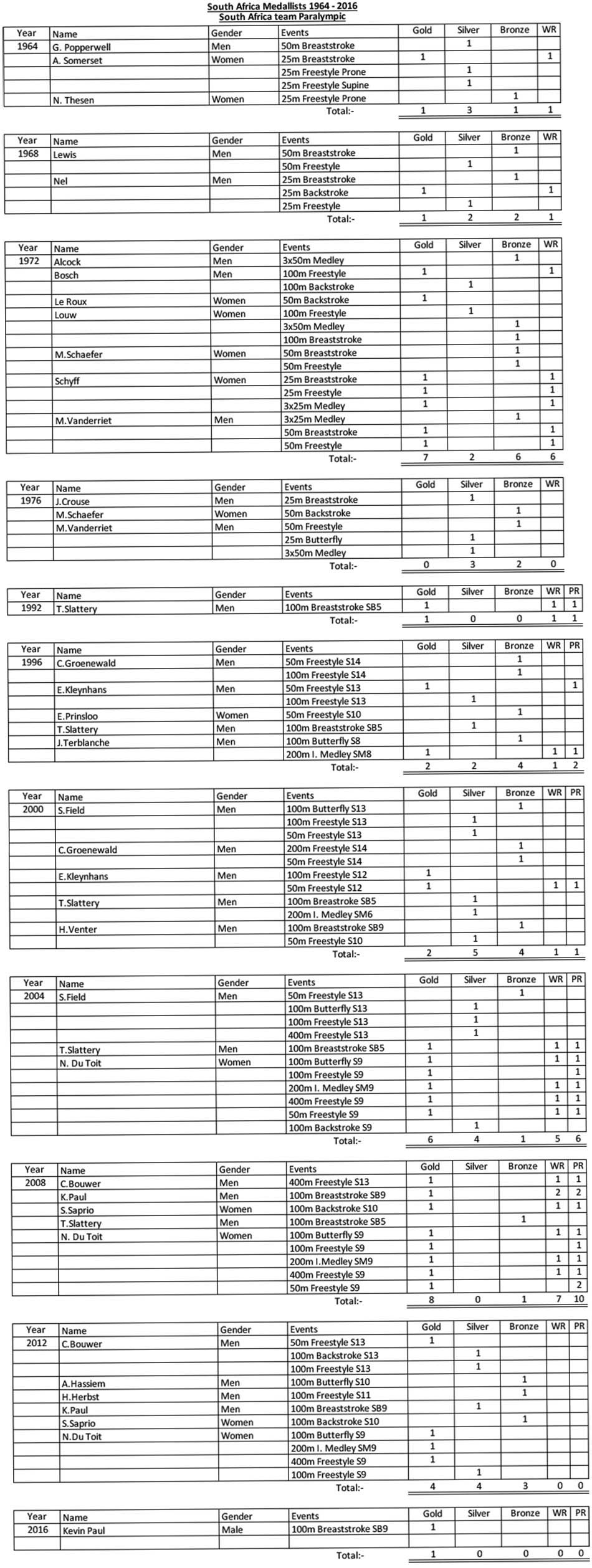 South Africans and Rhodesians have achieved considerable success in these events, particularly swimming. During the sports boycott era, Rhodesians continued to compete in South African events as a province, including paraplegic sports.