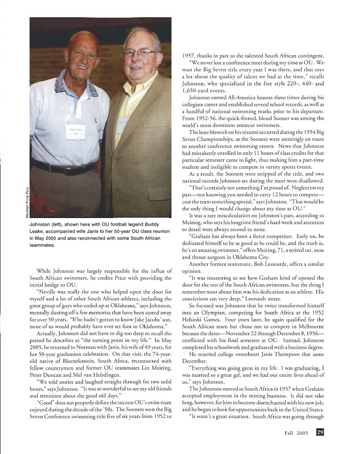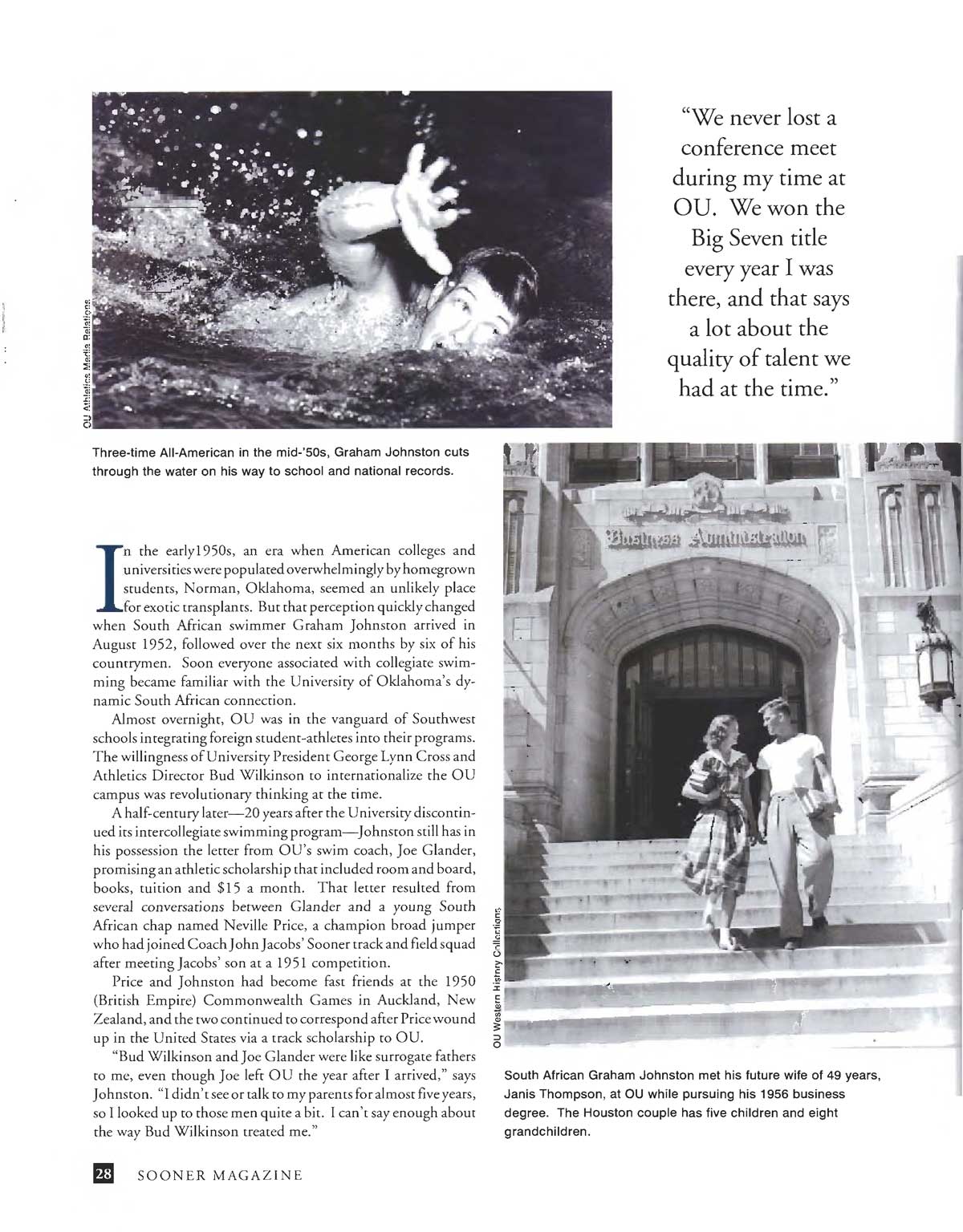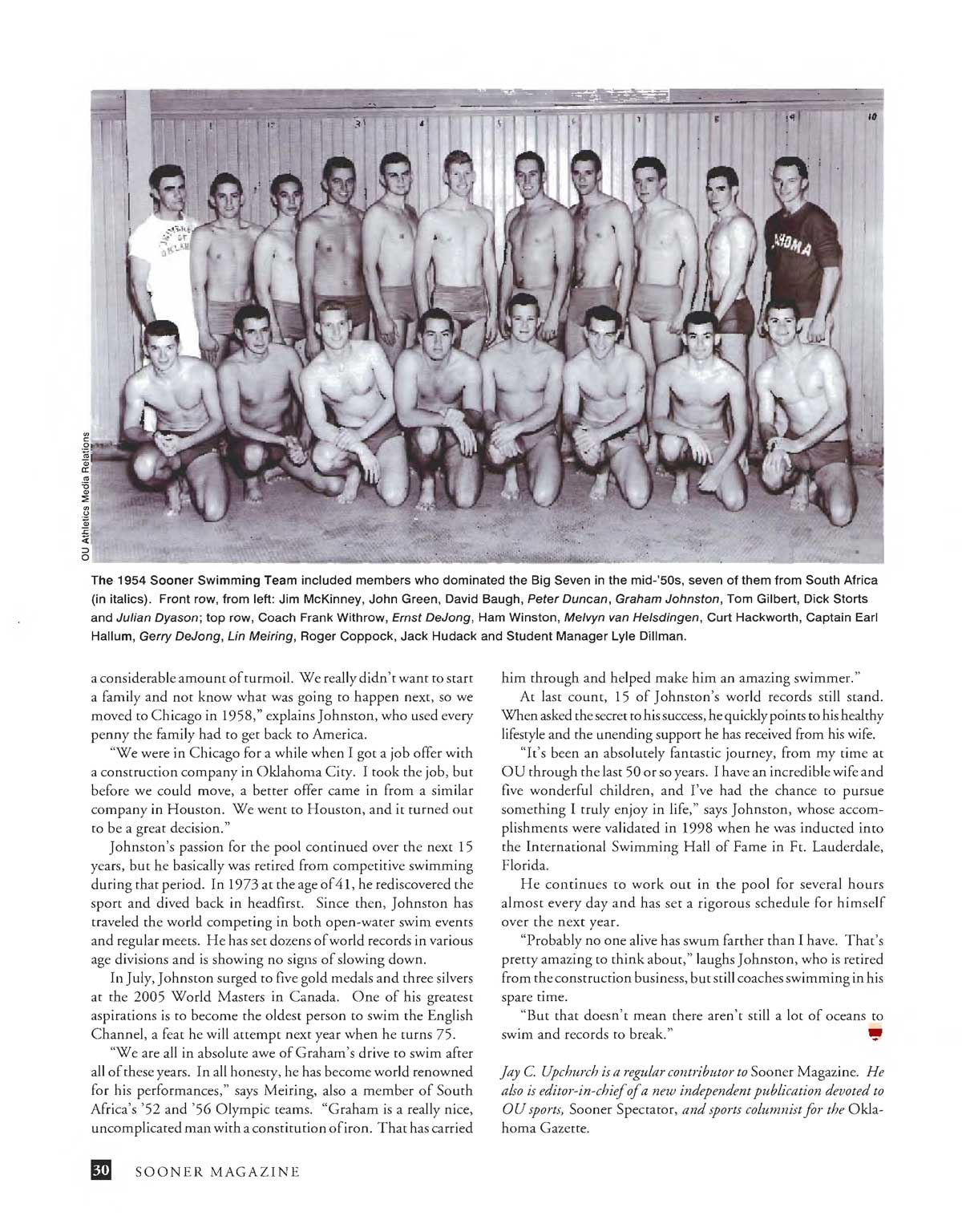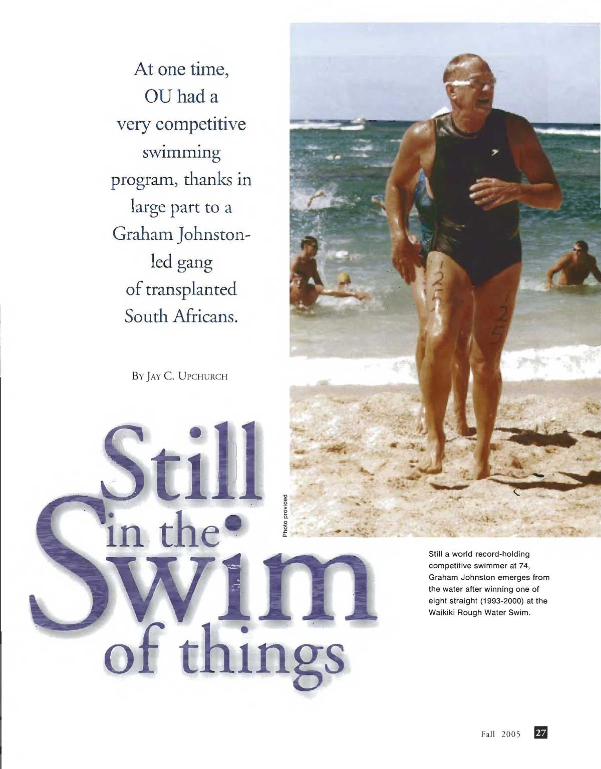 At 74, Johnston says he is in better condition now than he was when he twice qualified for the South African Olympic team in 1952 and ’56. The freestyler from Bloemfontein currently holds 15 world records in the masters division. A three-time All-American at OU, Johnston graduated with a business degree in 1956. He was inducted into the International Swimming Hall of Fame in 1998, two years before he retired from the construction business in Houston. He has been married to the former Janis Thompson for 49 years; they have five children and eight grandchildren.