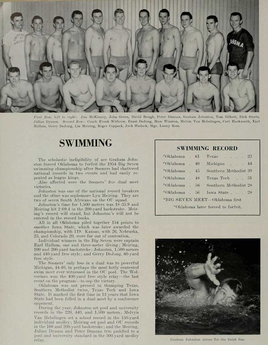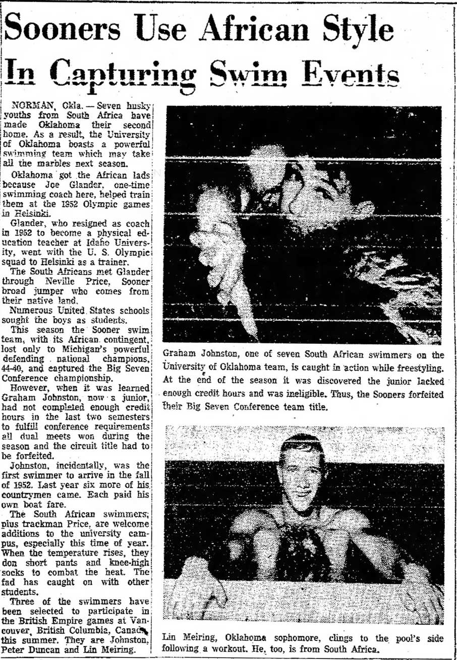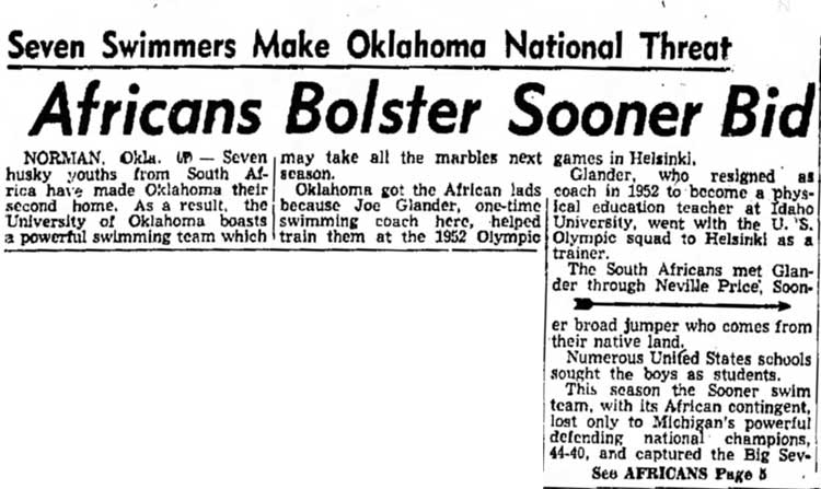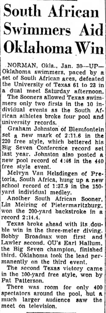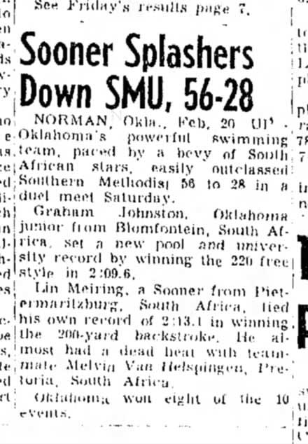 Once broadjumper Neville Price and swimmer Graham Johnston established a pipeline to the University of Oklahoma from their native South Africa, a small wave of South Africans took advantage by coming to Norman in the early 1950s. By 1954, seven members of the Sooners’ swimming and diving squad hailed from South Africa. Here is a quick glance at the lives of those seven, plus Price: