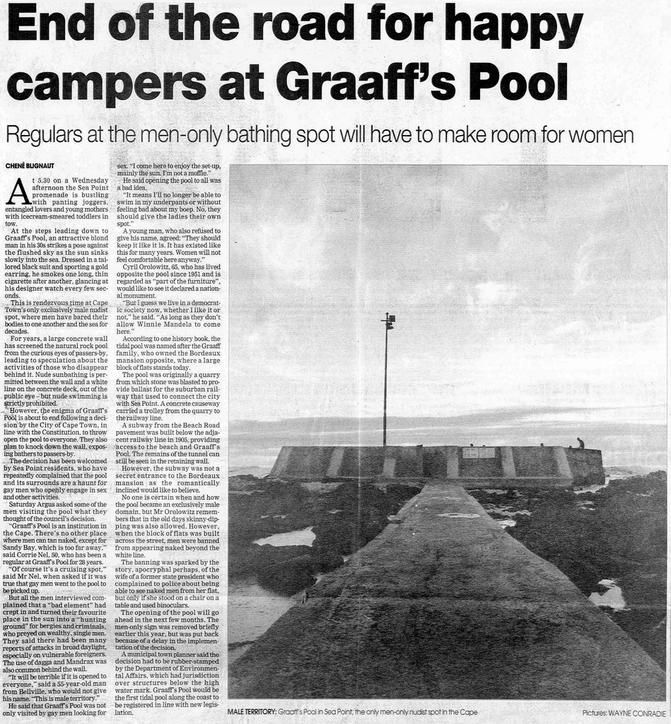 C. Blignaut. End of the Road for Happy Campers at Graaffs Pool, in Cape Argus (09/05/1999)