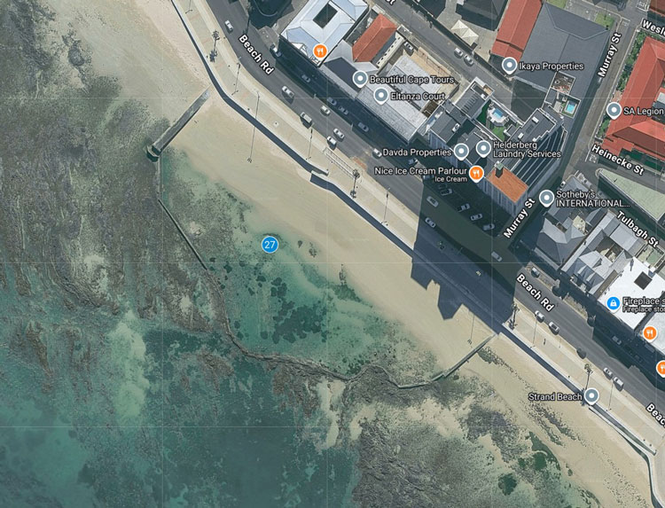 The Strand Jetty was a prominent feature of the Strand beachfront. The jetty was built by Murray and Stewart in 1934. It featured a 70-meter-long, 2.5-meter-wide walkway extending into the sea, ending in a larger 7.5 x 9-meter platform, constructed using large square Australian Jarrah timber log columns, which were driven into the seabed. Over time, the structure became derelict and broken, with its weathered beams remaining as a landmark, often described as a "skeleton" or broken structure on the beach.