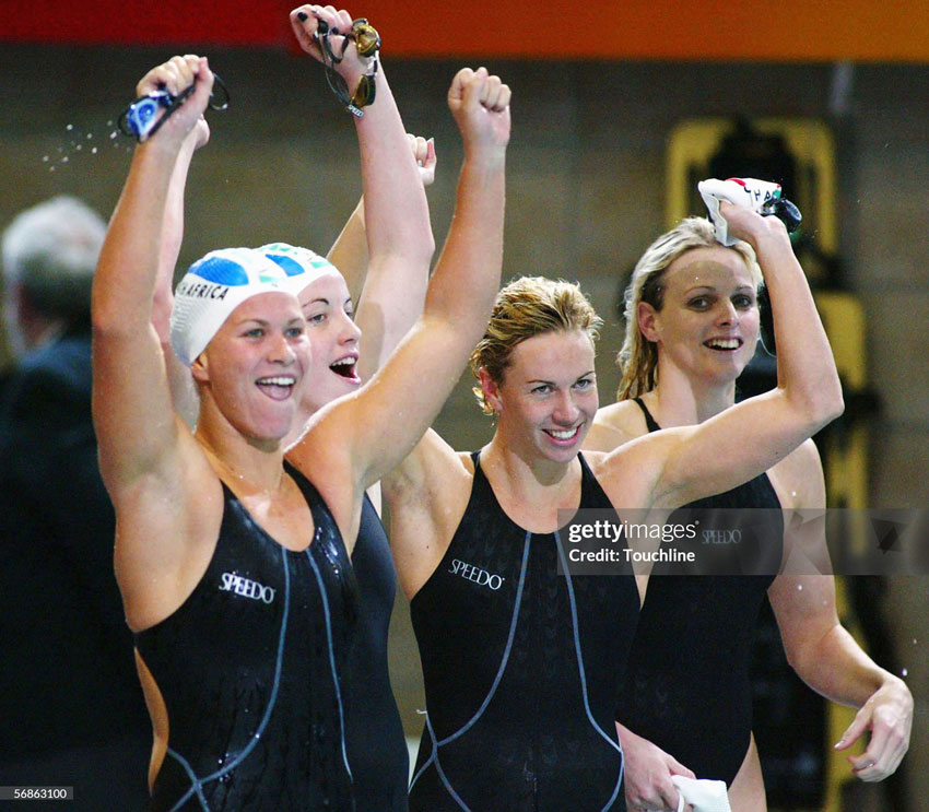 MANCHESTER, ENGLAND - AUGUST 4: (Special Fee Applies. Call for pricing) (L-R) Charlene Wittstock, Sarah Poewe, Mandy Loots and Helene Muller of South Africa win the silver medal in the Women's 4x100 Medley Final at the Manchester Aquatics centre during the 2002 Commonwealth Games on August 4, 2002.