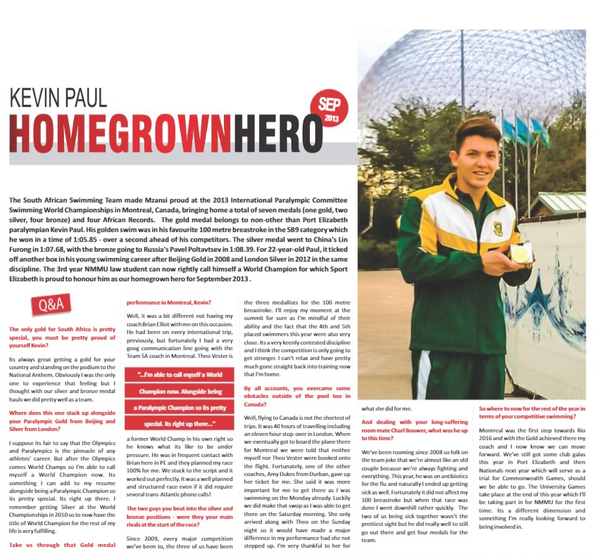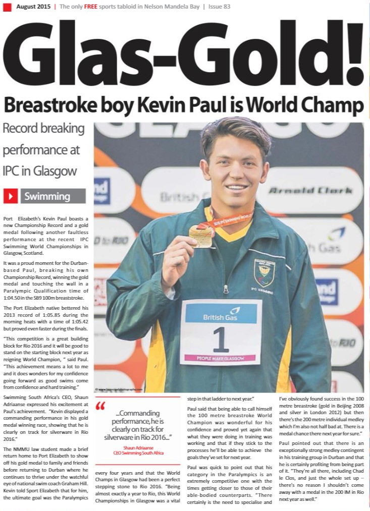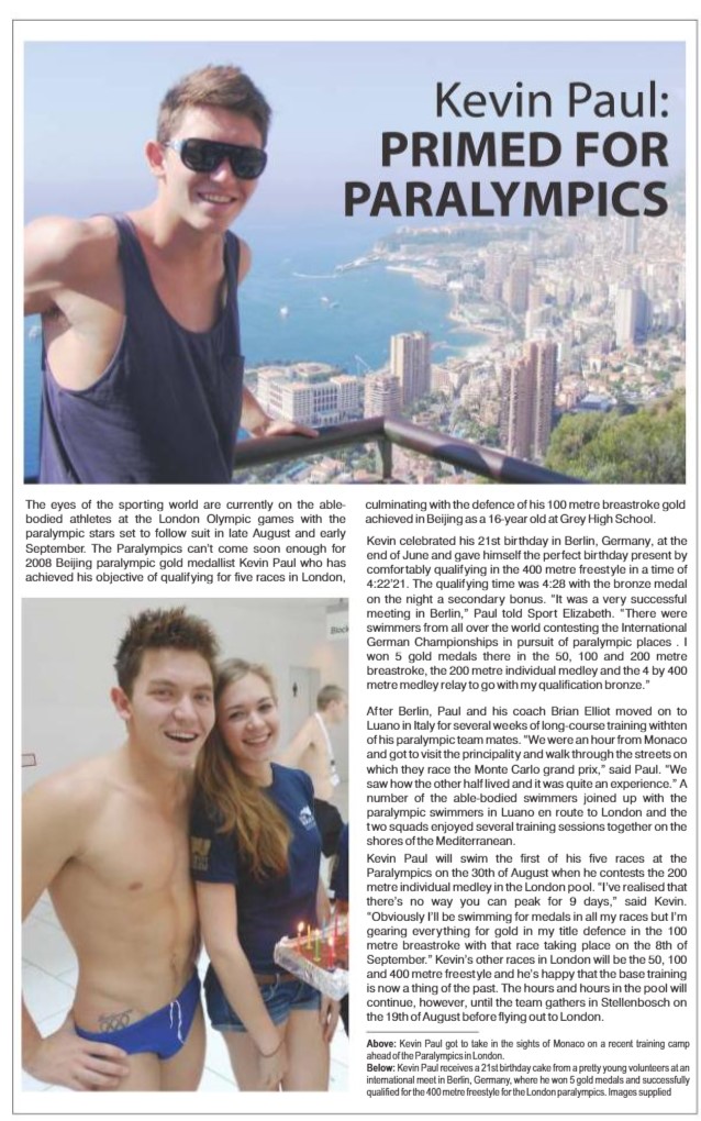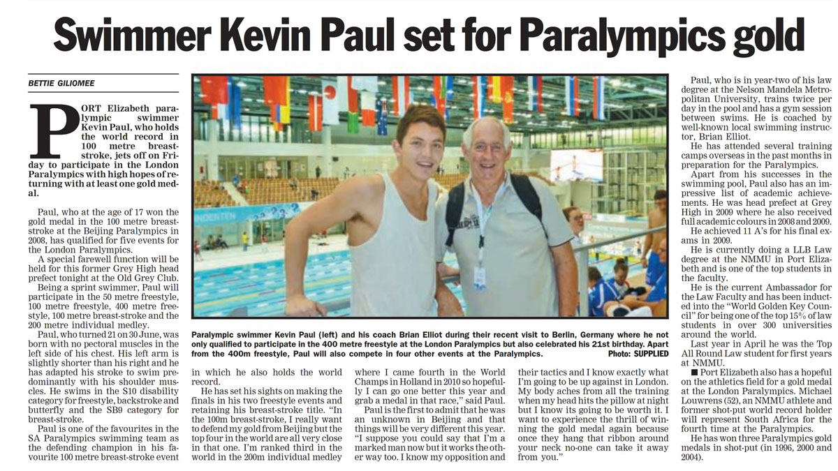 Kevin Paul was born in Port Elizabeth in June 1991. He was disabled swimmer who competed at three Olympic Games winning two gold and a silver medal in his event - the SB9 100m breaststroke.