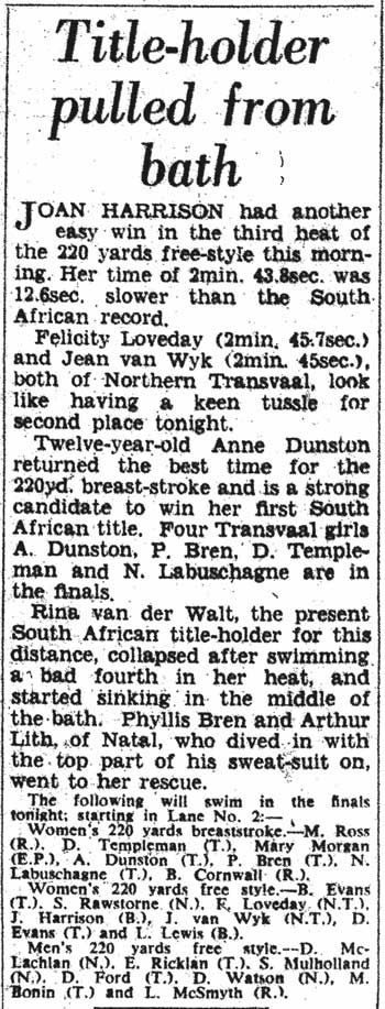Mary finished 4th in the 220 yard breastroke at the South African Championships in Johannesburg in 1953.