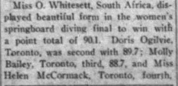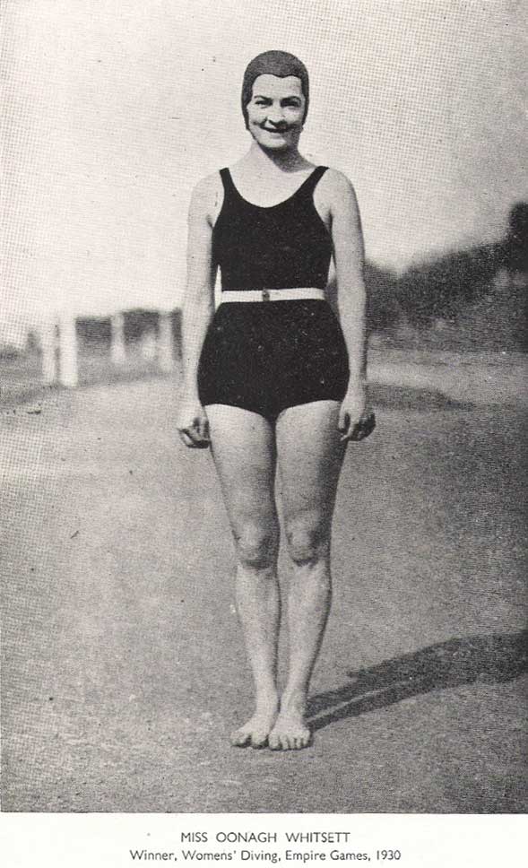 On August 7th, 1934 Oonagh Whitsitt finished 5th in the springboard diving at the Commonwealth Games held in London.