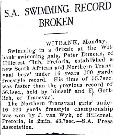 By 1952, some men had left South Africa to swim for the University of Oklahoma in the United States and were absent from the National Championships. peter Duncan won the 200, 400 and 1650-yard freestyle events before he too went to the University of Oklahoma at the end of the year. In the NCAA he was an All-American in 1954, 55 and 56.