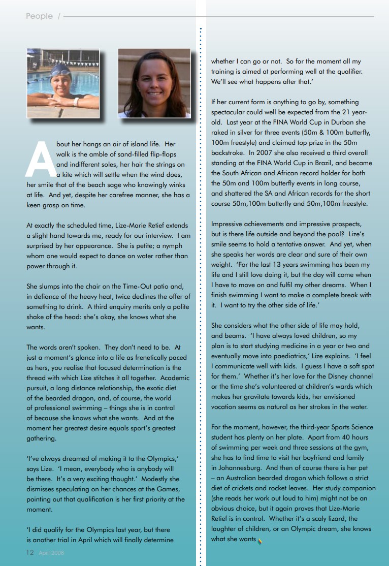 Die Suid-Afrikaanse Olimpiese swemmer, Lize-Mari Retief het agt jaar laas kompeterend deelgeneem en haar swempet intussen gebêre. Sy hoop om teen 2018 ‘n gekwalifiseerde dokter te wees.