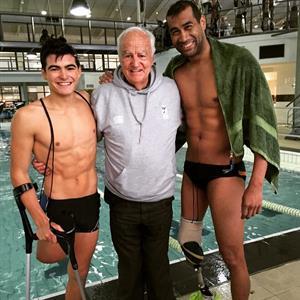 Caleb Swanepoel (left), Brian Button (Caleb's swimming coach) and Achmat Hassiem at the swimming pool when Caleb entered the water for the first time after his ordeal.
