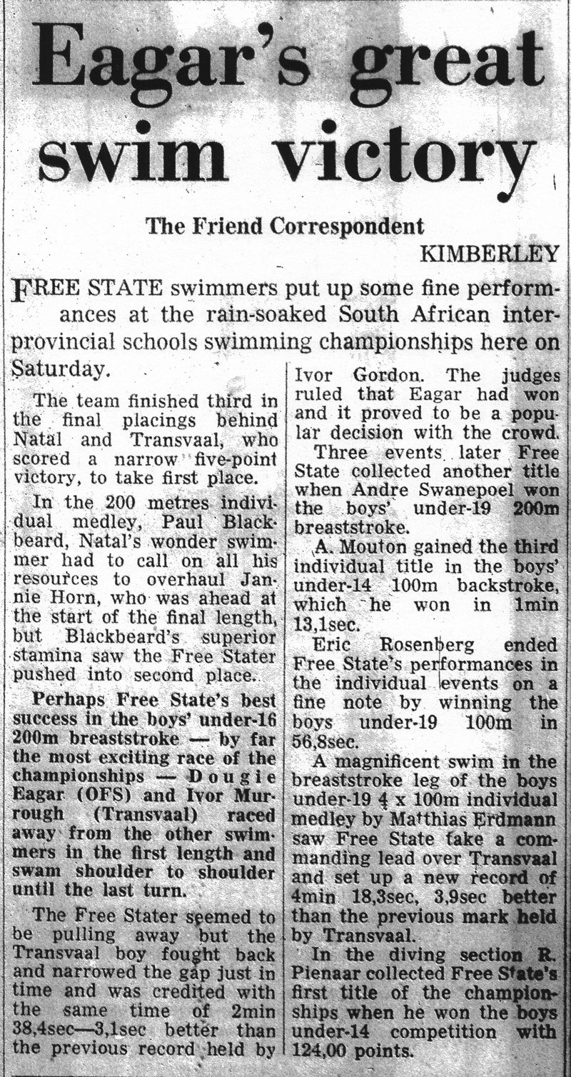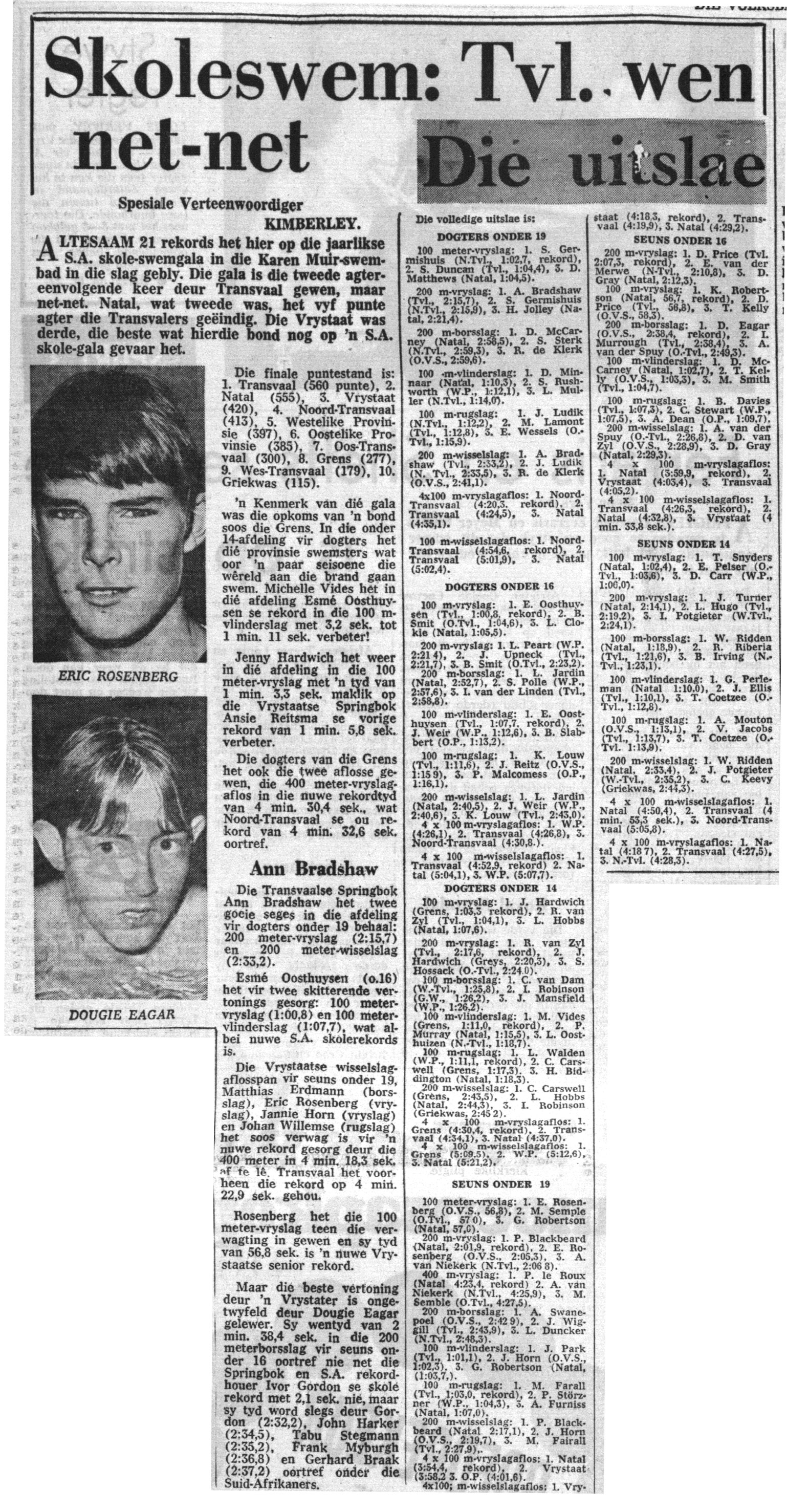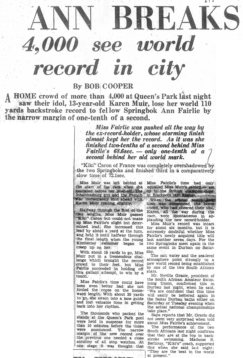 Galas were organised by the Griqualand West Swimming Union and attended by sell-out crowds of over 3000 people, who came to support their local hero, Karen Muir. Karen had set a world record for the 110 yards backstroke in 1965, at the tender age of 12. She gained instant international fame as the youngest person to set a senior world record.