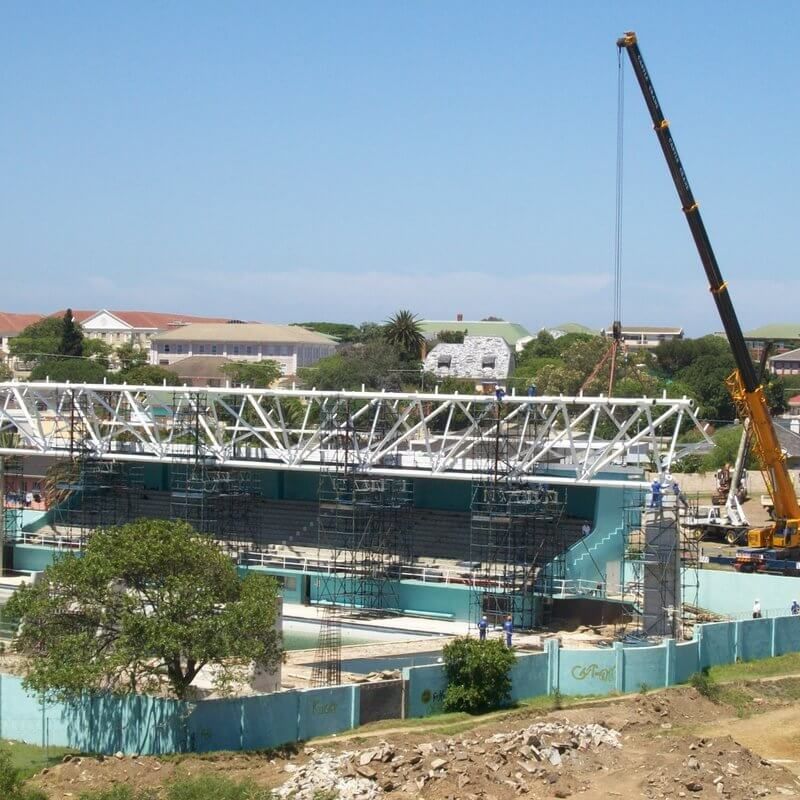 The brief required that the architects convert the existing 1950s-era Newton Park Pool from an open-air unheated pool to an indoor heated pool meeting international standards. Budgetary constraints dictated the retention of the existing concrete grandstand, which had to be incorporated within a new clear-spanning structure without imposing additional loads on existing structures or impeding sightlines to the pool.