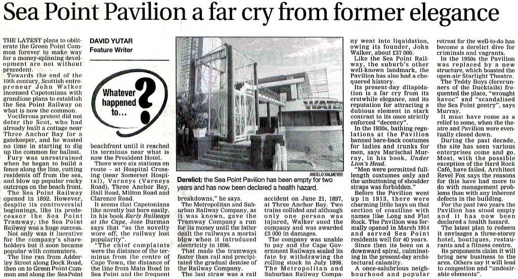 The first line connecting Sea Point and Cape Town was built in 1892. Two Pacific Type steam locomotives called Sea Point and Greenpoint were put into service on this line in 1896, making Sea Point Cape Town's first commuter suburb. They didn't last long as they used to derail regularly, and they were withdrawn from service by 1898. The line was resuscitated in 1905 and was electrified by 1927, but went bust again in 1929 as competition with a tram line heated up. One of the long term positive consequences of this endeavour was that the land belonging to the railway was never developed, leaving space for the Promenade's wide green lawns and wide walkway, which are ahead of you.