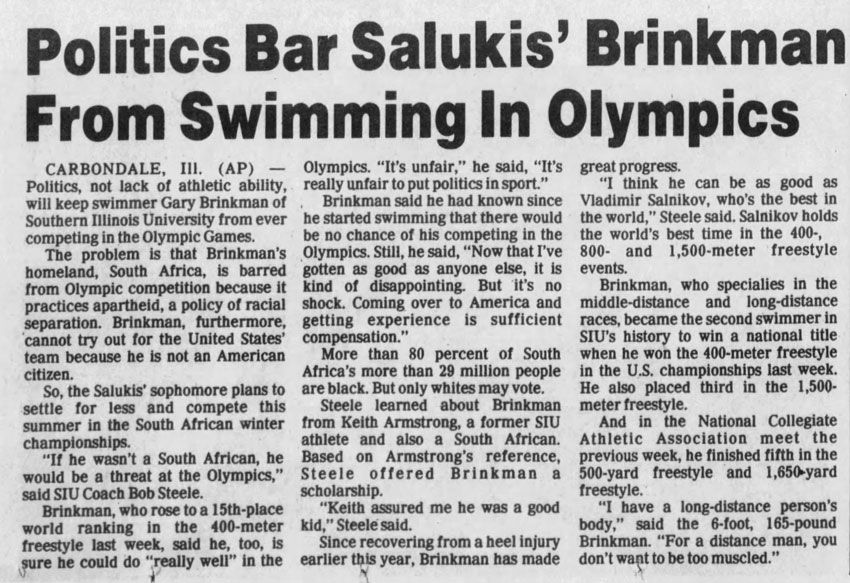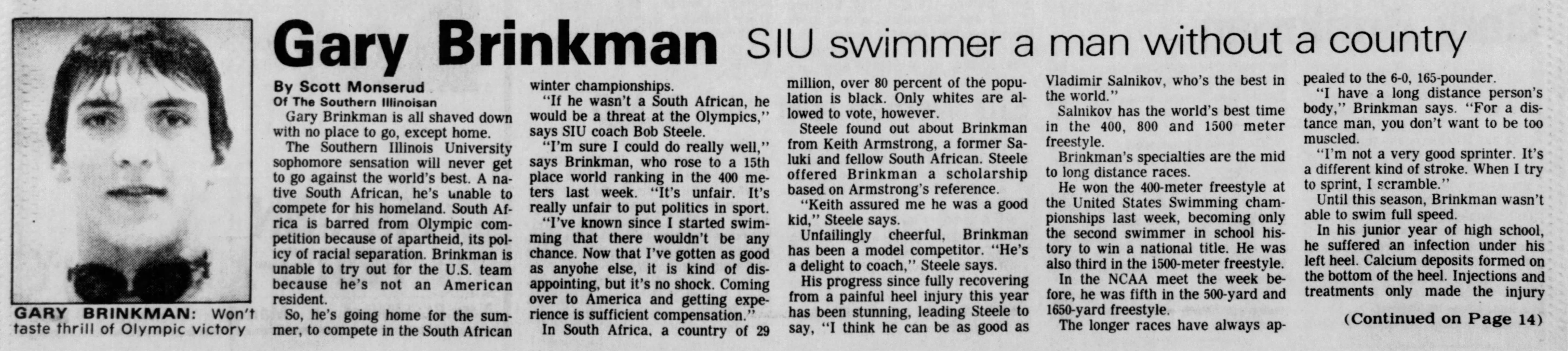 In 1981 and 1982 he won the Midmar Mile. At the South African swimming championships in 1982, Gary won three gold medals. In January 1983 Gary Brinkman took up a scholarship and joined fellow Springboks Erwin Kratz and Gerhard van der Walt to swim for the University of Southern Illinois, and by 1984 he had already won a US national swimming title. At the US nationals in August, he won the 400m freestyle in 3:55, 24., which was a significant improvement on his winning time at the South African Championships in Pretoria in 1982 was 4:10,79.