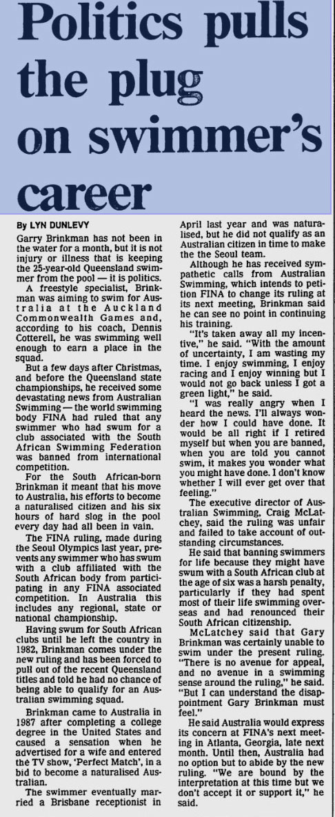 He moved to Australia after he graduated in 1986. On the Gold Coast of Australia, he swam with coach Bill Sweetenham at the Australian Institute of Sport. In Australia, he continued to swim in Queensland. where he hatched a plan to get to the Olympics in 1988. He married an Australian to get Australian citizenship. Unfortunately, the Australian government objected, and despite marriage, he was ruled ineligible to swim for Australia.