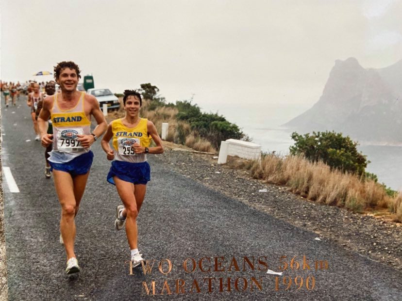 Well, it's kind of an interesting story. When I handed over the squad to Santa van Jaarsveld. And I just felt my swimmers were too good and I couldn't afford them the time with a full-time lecturing job. I was heartbroken really. Every evening when it was swimming time I was wondering what they were doing. Santa was really good she would keep me informed How are my swimmers who I regarded or miss as my children. And so I just decided - you remember Marietjie? Do you remember my best friend Marietjie? She said to me, why don't you do something, go run or do something. The first time I went out the front door, the furthest I could run was for seven minutes. And so I just persisted and lost weight and so I felt pretty good and I just kept myself busy, and I did the same diligence as I did with some coaching I started reading everything about it and what I needed to do and then I hooked up with a running group in the Strand, well Somerset West and the Strand. Back in those days, everybody was still running for Helderberg Harriers and I happened to be in the dentist's chair the one day when my dentist said to me that, oh you, I hear you interested in running you should come and run with our group and he's the guy that I now live with, in Canada. So we started running and we ran together and I think just the lung capacity that I had from swimming and diligence. I mean,, we are crazy people that stare at the blank line up and down for hours on end and I come from the era where we did high mileage, swimming, we were 8000 9000 meters a session. And so I just, I just grew to love it and I remember the day that I ran my first marathon I sent a picture and landed up me with the Defense Force guy, and he was also a former swimmer. And that was my first marathon and we finished in the stadium at Stellenbosch University the athletics stadium at Coetzenberg. And it was quite exciting because Santa had heard that I was running, and she let the squad out early. So all the swimmers were lined up at the end of the marathon and that was the start for me and I became hungry and then actually too hungry, because with excessive miles come injuries and. So that led me to dabble in triathlon afterward because then I could swim and bike is a relief from the running so that's basically how it happened and I still run, I run 6 to 7 times a week now at my ripe old age. I just keep going on it so that's really how it happened I was missing the swimming so much I wanted to keep myself busy.