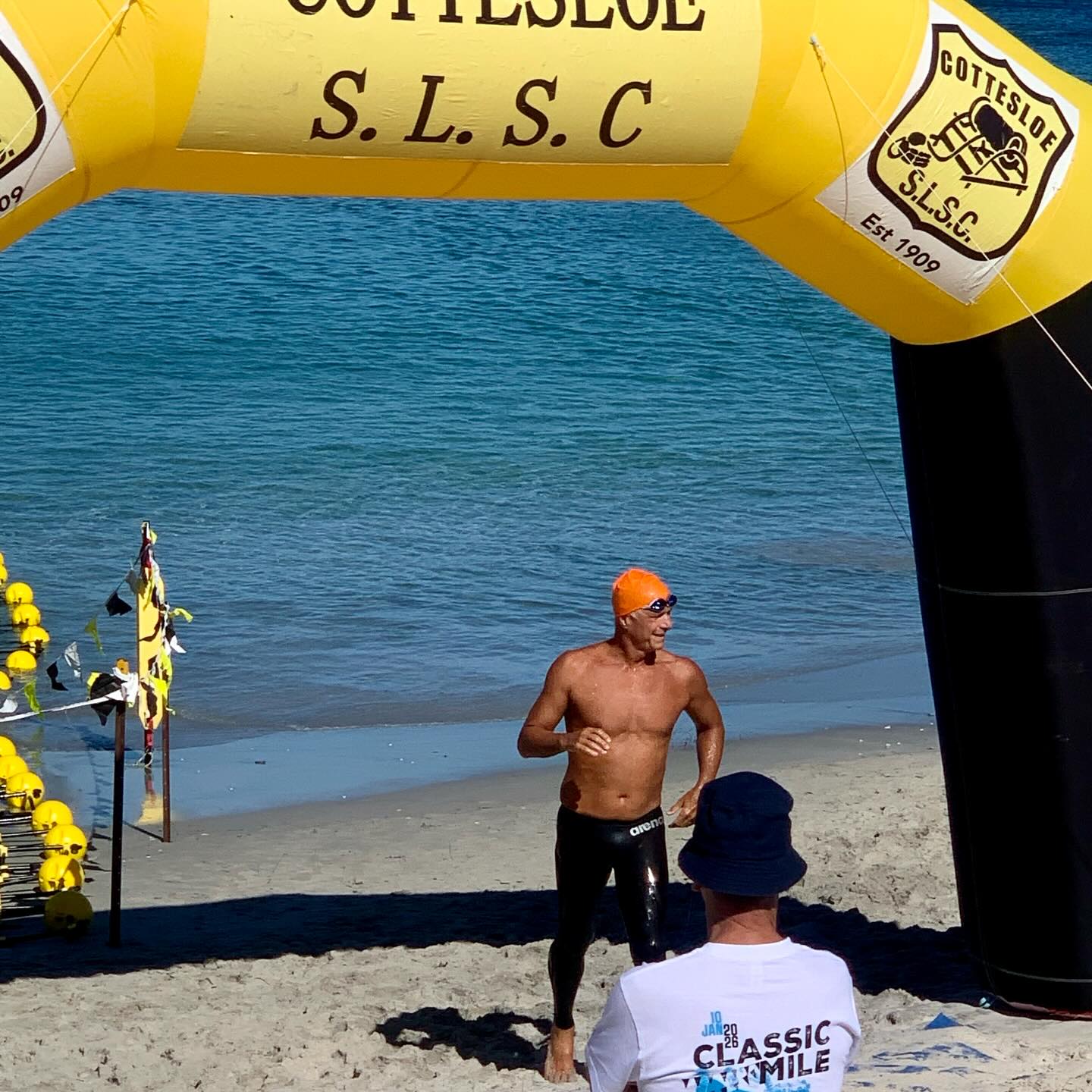 The first swimmer to cross the finish line overall in the 5km race was 58-year-old Paul Blackbeard from Perth. Having grown up in South Africa, Paul is a veteran of the surf and also a former South African national (pool) swimming champion.
