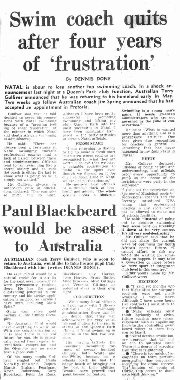 It would be difficult to find a more successful person in the world than Paul Blackbeard. A Local Hero of South African sports and an international phenomenon in both Masters and open water swimming. As an elite athlete, he stayed and competed locally, while the world boycotted South Africa and many athletes did relocate to American universities to compete overseas. Later in his life, he relocated overseas with his wife Linda and children Lance and Bianca. He is now officially retired and lives in Perth, Australia, where he continues to dominate in various types of pool and open-water swimming events.