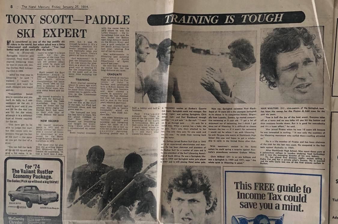 In 1974, while the Springbok still water lifesaving team was competing in Europe, Paul Blackbeard broke the world record in 200m obstacle race.