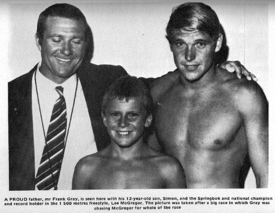 Under Frank’s guidance, all four Gray brothers earned their Springbok colours, but it was Simon who scored a rare distinction when he was selected for the Springbok team at the age of 13 and improved the national senior record (1500m freestyle) at the same age.