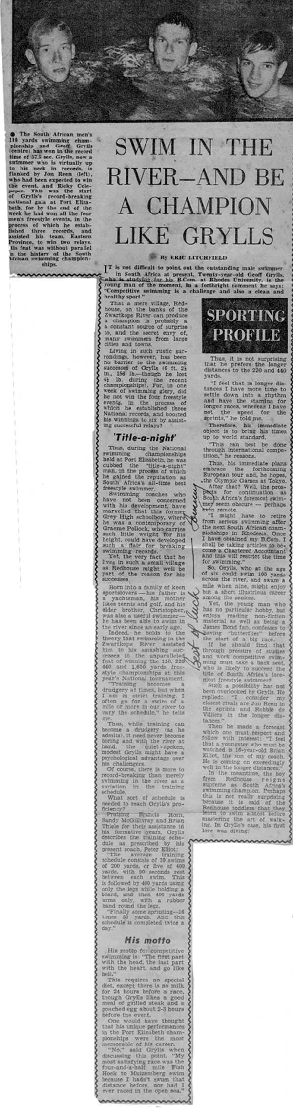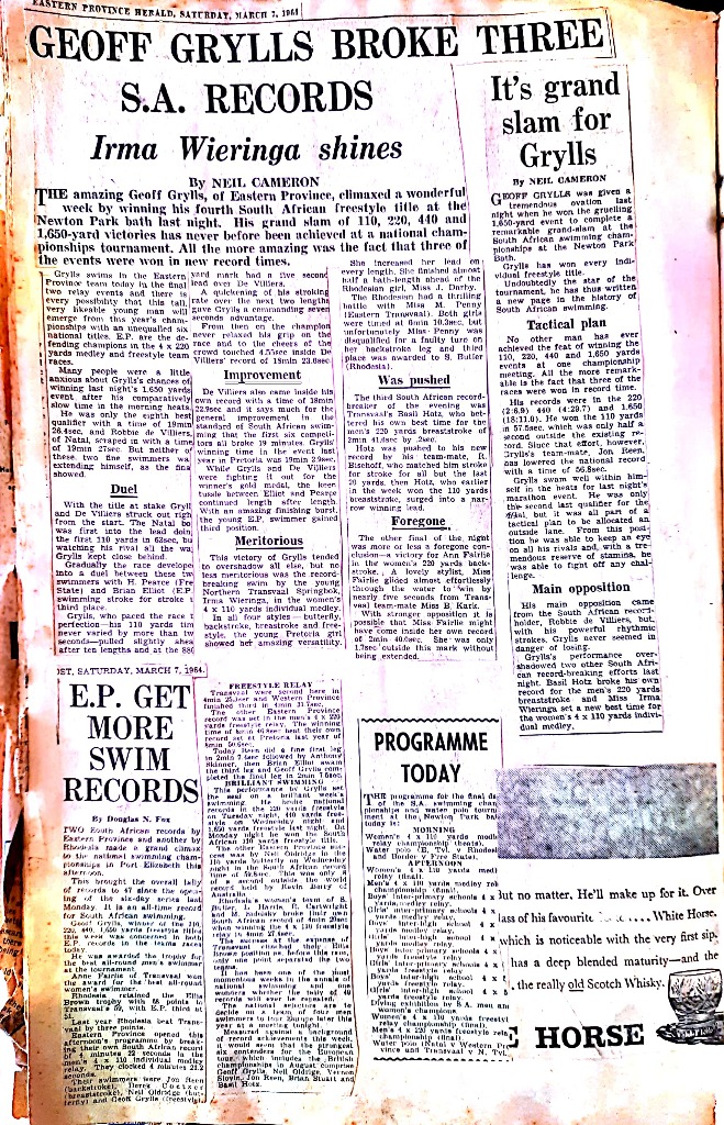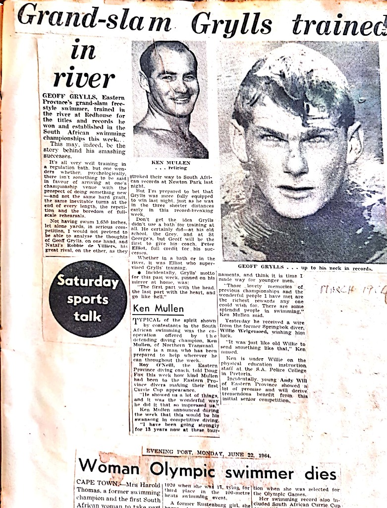 Asked how he would know his reactions when he finally got into the strange surroundings of a marked-off swimming pool, Grylls replied: “Well, I didn’t know. In fact, the week before the 1964 National Championships, where I won all four South African freestyle titles, my coach Peter Elliott said ‘I have absolutely no idea how fit Geoff is because he swims in the river!’