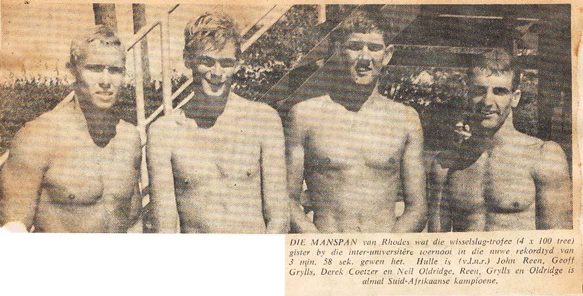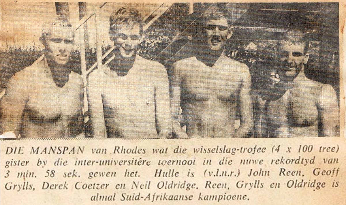 Lifesaving champs against Durban at North Beach you had no chance, they had it so sussed. Anyway, so that year was the year that I won that 100 200 400, and 1500 in 64 in Port Elizabeth, so I was a big hero. The mayor had a cocktail party for me. So, and I believe that Ryk Neethling is the only person that's done that. Won the 100 200 400 and 1500. So, I suppose I've got a record that nobody can beat. Oh yes, and then Eastern Province when the 4x100, 4x200, and the 4x100 medley. In that year I've got a feeling that 40% of the points won at Nationals were won by Eastern Province swimmers. We were just, like it happened, it was amazing. Johnny Reen, who I beat in the 100, then broke the South African record swimming first in the 4x100. Neil Oldridge was the South African butterfly champion. Derek Coertze came second in breaststroke, so we had just a funny team and we all went off to Rhodes. So Rhodes that this amazing team.