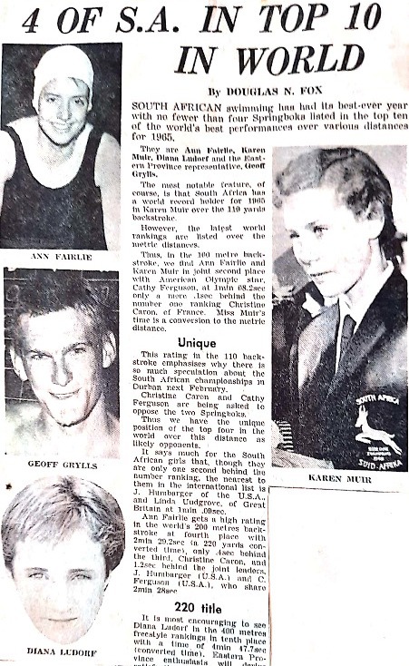 1966 As a member of the South African Team toured USA and competed in the American National Championships in Lincoln, Nebraska, where he tied with 3rd fastest time in the 200 metres freestyle but was given 4th place time. Don Schollander and John Nelson were first and second, respectively in world record time. (Grylls beat the up-and-coming 16-year-old Mark Spitz in this race in which Spitz was swimming in his first National Championships.)