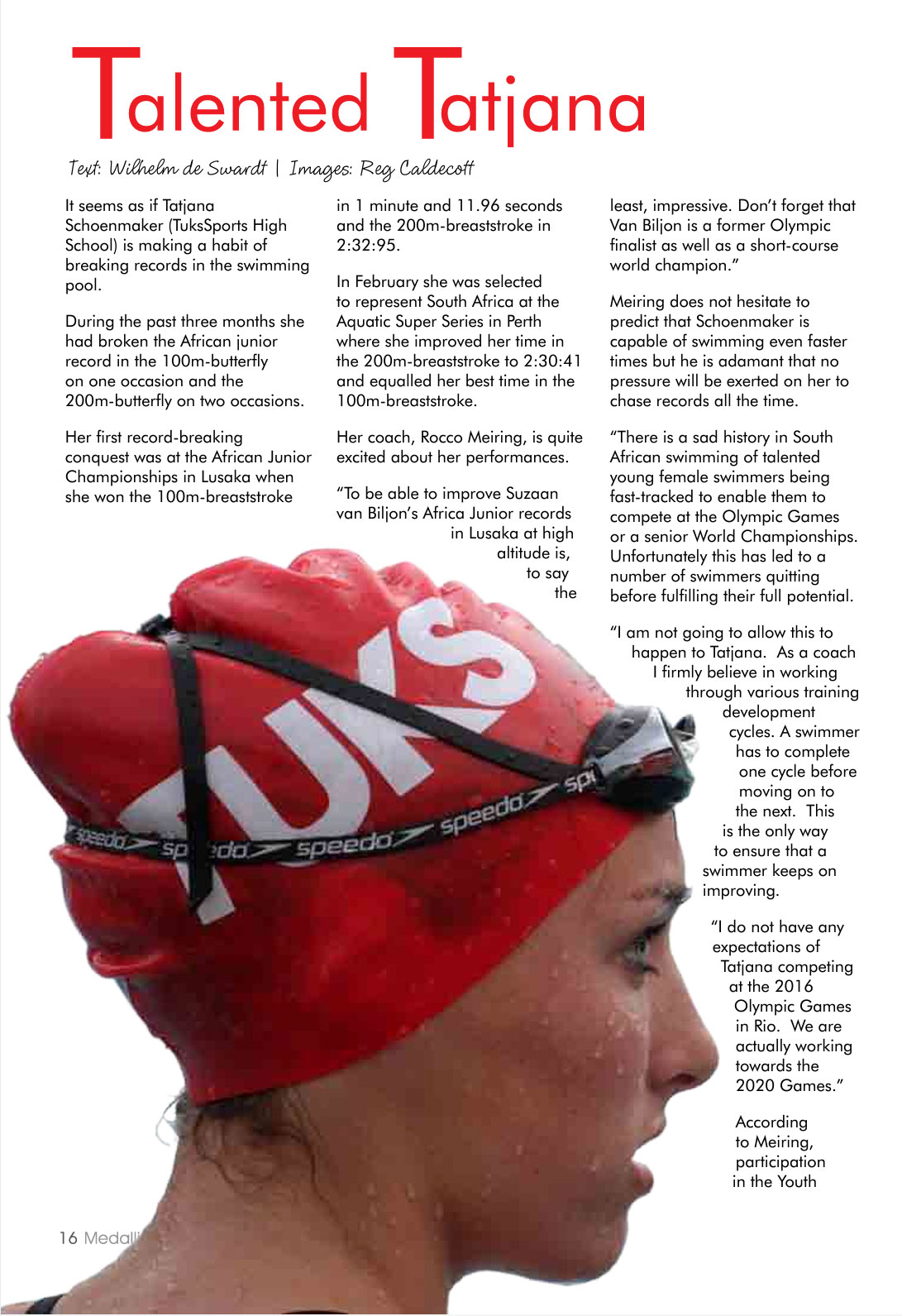 Swimmers, male and fe male, stay unshaved until competition. “We dry-shave. It takes o a layer of dead skin — it helps with sensation in the water.” Van Biljon, a hospitality management student at Tukkies, shares a house with other Pretoria-based students, including 400m hurdles star LJ van Zyl. She’s originally from the same city as Neethling, Bloemfontein, although she didn’t meet him until she started competing at the senior national championships. “I knew his sister [Jean-Marie], though.”