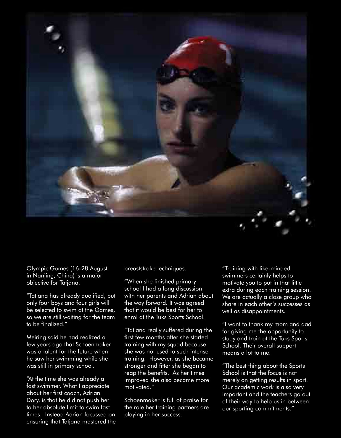 “Like every individual sport, swimming requires a lot of hard work,” Suzaan says as she explains the demands of being on top. “It’s like a full-time job because I train for nearly six hours every day. But I don’t mind – I get out what I put in.”