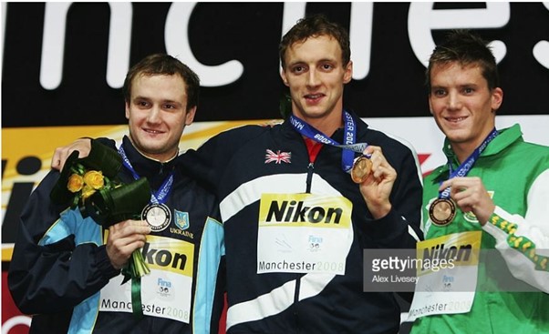 Igor Borysik of Ukraine celebrates the silver medal, Kristopher Gilchrist of United Kingdom the gold medal and William Diering at the 2008 World Short Course Chamionships in Manchester.